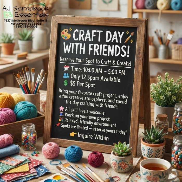 Our store has dedicated seating available for groups who would like to come in and work on crafts such as scrapbooking or card making. It is a great space to gather, create and enjoy time together. Please call the store directly (239-489-0008) to schedule your group and reserve your seats. We look forward to crafting with you.