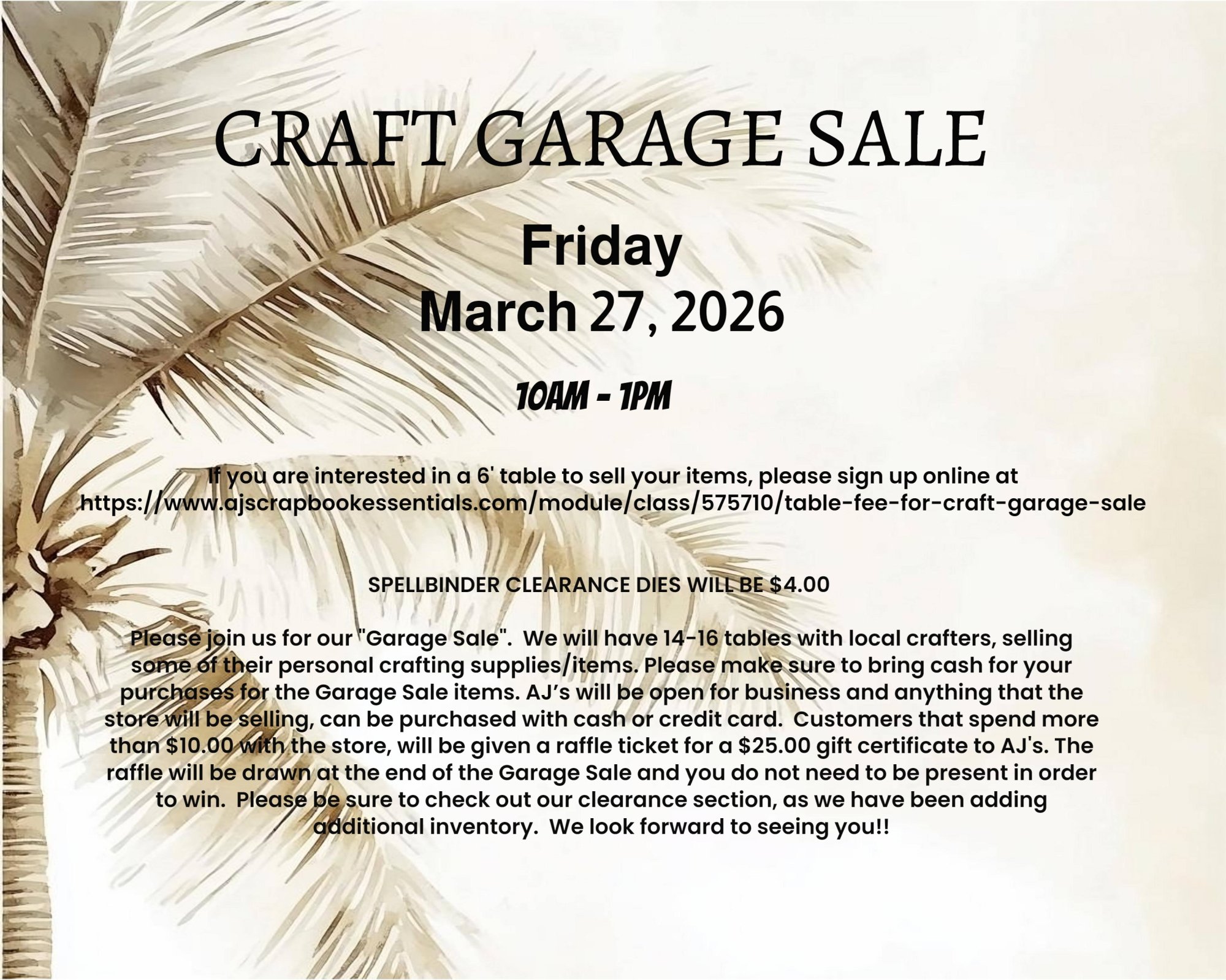 In order to guarantee your 6' table for the Craft Garage Sale, you must sign up and prepay the $10.00 fee. Due to the limited amount of tables, there will be NO REFUNDS.